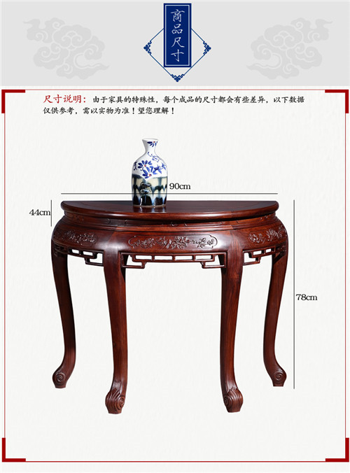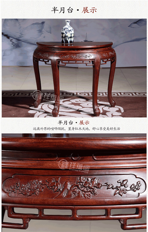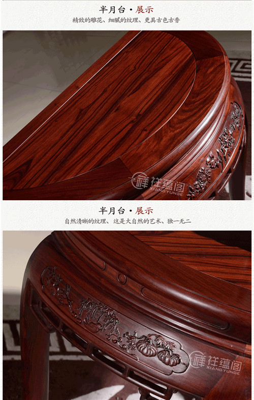 这件红木条案名为半月红木条案,顾名思义就是造型取自于半月,这种独特的半圆形设计既保证了红木家具的庄重,又满足了现代人追求独特的需求。